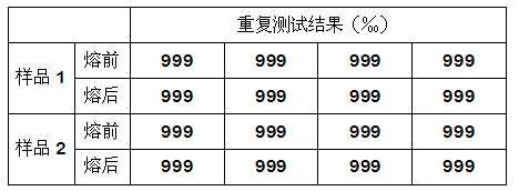 1. 通過試驗發現,該足金吊墜熔融前后的質量、金含量變化甚微,說明該樣品由足金制成,未附著在有機物材質(如塑料、特種紙質等)基底上。